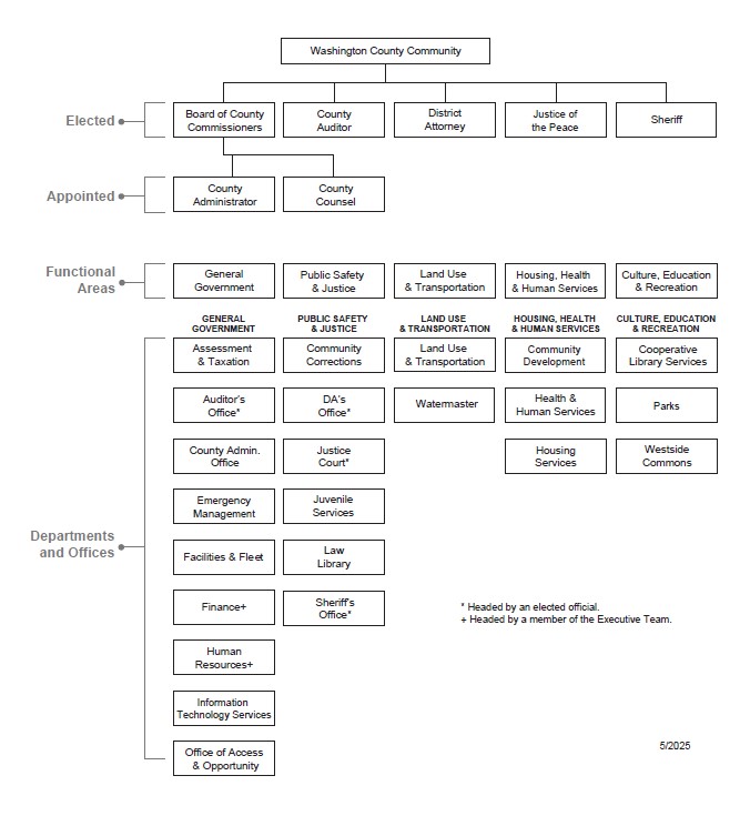 The voter-approved Washington County Charter provides for a Council-Manager form of government. The Charter gives the five-member Board of County Commissioners legislative responsibility. The Charter also designates administrative authority to a board-appointed, professional County Administrator.