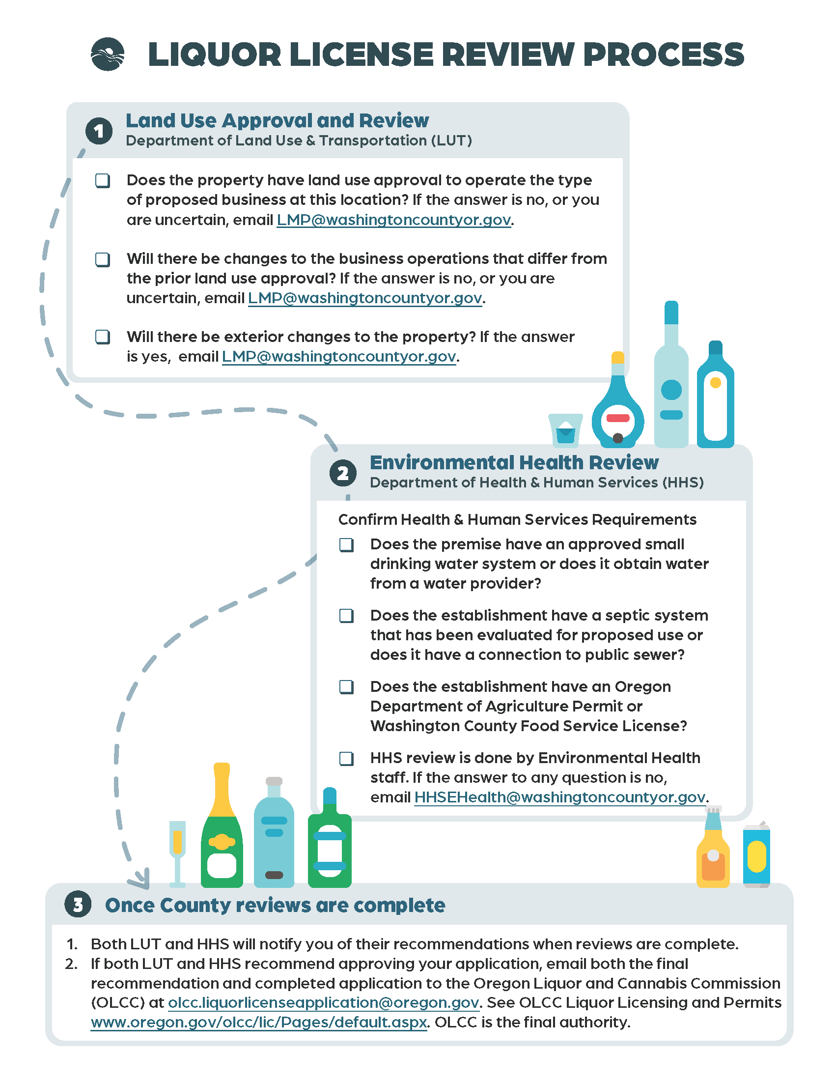 2. If both LUT and HHS recommend that the applications be approved, email both the final recommendation and completed application from OLCC's online system CAMP (Cannabis and Alcohol Management Program), to OLCC at [email protected]. See OLCC Liquor Licensing for more information.
