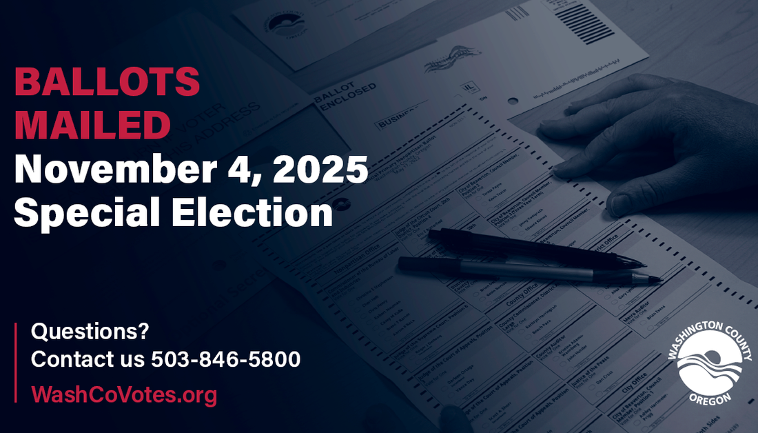 Washington County Elections has mailed ballots to all registered voters for the Special Election being held on Tuesday, November 4, 2025. Voters can expect their ballots to arrive via the United States Postal Service (USPS) by Wednesday, October 22.