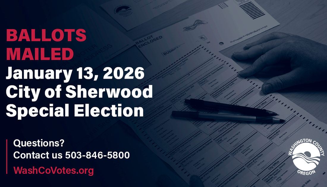 Washington County Elections has mailed ballots to all registered voters in Sherwood for the Special Election being held on Tuesday, January 13, 2026. Voters can expect their ballots to arrive via the United States Postal Service (USPS) by Wednesday, December 31, 2025.